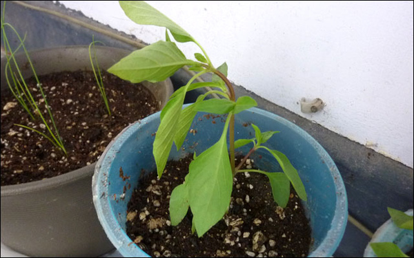 我媽在那個空地闢了一個小畦,種了辣椒,蒽之類的,其中還有一株不小的九層塔