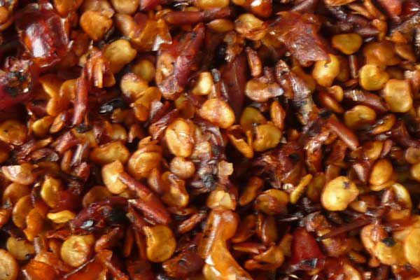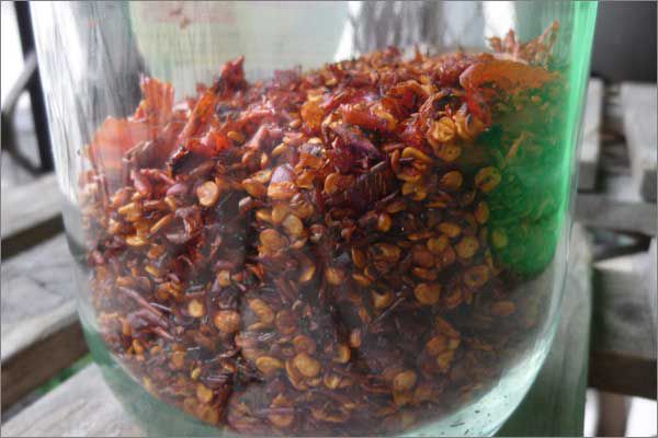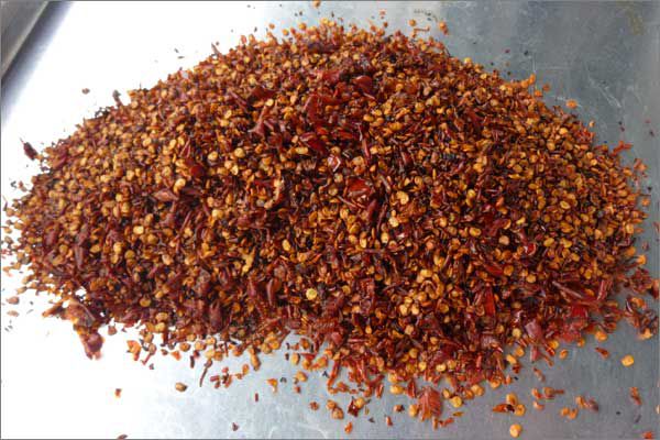 @自製的粗粒辣椒粉,色彩看起來是暗紅色的,但市面上都很紅,料想是加了色素。
