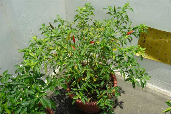 @我的辣椒粉是這二秼的果實,下面這秼似乎快掛了,它拼命生了一堆辣椒,然後葉子開始黃掉。